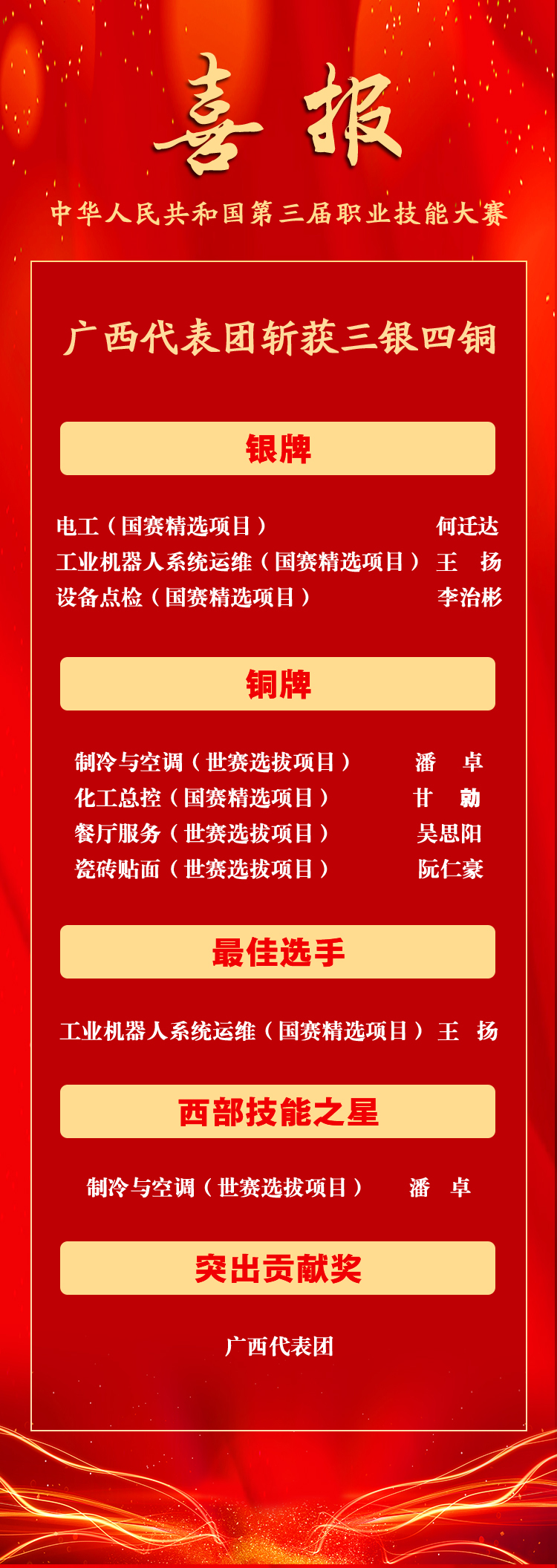9月23日,為期5天的第三屆全國技能大賽在鄭州落幕,廣西代表團(tuán)斬獲3銀4銅,32個競賽項目排名進(jìn)入全國前十,47個競賽項目獲優(yōu)勝獎,創(chuàng)下廣西參加該賽事的歷史最佳戰(zhàn)績。