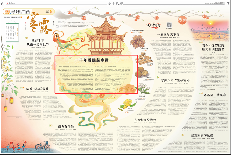 香飄千年。來源:大作網(wǎng) 寒露至,草木染露為霜,而八桂山川卻因香料豐饒,始終縈繞著暖融融的芬芳。 廣西香文化,從秦漢郁鬯祭酒綿延至今日綜合產(chǎn)值約550億元,既是穿越時空的民族記憶,更是人與自然共生的生態(tài)智慧。循著沉香清醇、八角辛烈、桂花馥郁、零陵香濃郁,便能讀懂這“小民俗”里的“大時代”。 “沉檀龍麝”首推沉香,北流沉香線香制作技藝,被列入廣西非遺名錄,其歷史可溯至清代。香農(nóng)“以香易鹽”的古老傳統(tǒng),如今演變?yōu)楝F(xiàn)代化產(chǎn)業(yè)鏈,但壯族“特掘”傳說中,竹簽香點燃的祈愿與對自然的敬畏從未消散。玉林古籍載,北魏時鬱林先民以香草釀郁鬯酒獻祭,如今沉香博物館的香道表演,仍延續(xù)“香通三界”的古老信仰。寒露里,上林壯族匠人將樸吉樹葉、樟木與沉香研粉制盤香,防蚊驅(qū)蟲又含祭祀之意,恰如 《嶺表錄異》 記唐代玉林人“以鹽酪姜桂調(diào)齏”的飲食習俗——香既是通天地的媒介,亦是日常的守護。 “無藥不過玉林,尋香必至玉州”。玉林國際香料市場集散全球2/3 香料,本地牛巴自唐宋以姜桂調(diào)味,今添八角、肉桂成“舌尖上的非遺”。寒露食俗中,桂林木樨香循古法萃桂花精油入茶飲糕點,是“秋補”養(yǎng)生,亦是對 《桂林府志》“桂山多桂”的千年回應。香亦為藥:北流沉香精油安神,上林古香中密蒙花明目,瑤族藥浴包中山蒼子驅(qū)寒、零陵香消炎,這些山林饋贈經(jīng)現(xiàn)代科技化為精油、膏方,成“綠水青山”變“健康紅利”的注腳。 寒露前后,橫州茉莉農(nóng)送最后一茬鮮花入窨茶車間,制出茉莉白茶、茉莉酥;平樂桂農(nóng)烘干八角,通過產(chǎn)地倉直供海外——恰似“海上香料之路”的當代回響。玉林福達香料港900畝園區(qū)內(nèi),印尼肉豆蔻與廣西八角交匯,昔日“香幫”馬蹄聲,已成冷鏈物流引擎轟鳴。金秀大瑤山的靈香草 (古名“零陵香”,源自古零陵郡) 正釋馥郁,費孝通五上瑤山,盛贊靈香草產(chǎn)業(yè)是“多元一體”的縮影:瑤族“曬衣節(jié)”用它防蟲,漢族客商攜技術(shù)進山,壯族姑娘以“八角媳婦”融入瑤寨。這縷香氣,終成民族團結(jié)的催化劑。 節(jié)慶亦成文化IP:南寧“非遺年味”活動中,壯族古香、沉香手鏈成游客伴手禮;玉林“尋香之旅”線路串聯(lián)沉香驛館與藥膳養(yǎng)生街,讓香文化從祭祀煙霧升華為“芳香經(jīng)濟”。如今,香料產(chǎn)業(yè)正邁向“千萬畝面積、千億元產(chǎn)值”的綠色支柱,而民俗傳統(tǒng)則是其最深厚的文化底色。 寒露凝香,萬物收成。廣西香文化從祭祀莊嚴到產(chǎn)業(yè)蓬勃,從藥食同源到生態(tài)循環(huán),始終詮釋著“天人合一”的古老哲學。當現(xiàn)代工藝遇上古法炮制,全球市場對話鄉(xiāng)土智慧,這片土地正以芬芳為筆,書寫跨越千年的“香料史詩”——是嗅覺盛宴,更是對自然的禮贊,是對生命的虔敬、對未來的希冀。 (作者系廣西美育學會副會長、南寧市社會科學院東盟研究所所長,副研究員)