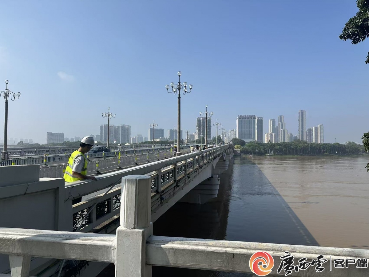 工作人員在邕江大橋巡查跨江橋梁安全及洪水情況。