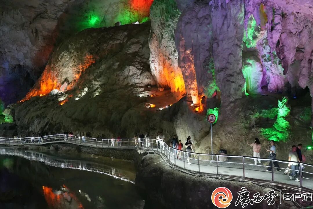游客在巴馬百魔洞游玩。 作為“明星景區(qū)”的百魔洞,入口處早已排起長(zhǎng)隊(duì)。游客們有序等候,依次進(jìn)入洞內(nèi)。只見(jiàn)鐘乳石千姿百態(tài),在燈光映照下流光溢彩、如夢(mèng)似幻,或如飛禽走獸活靈活現(xiàn),或似瓊樓玉宇巍然聳立,令人嘆為觀止。游客紛紛駐足拍照,定格下這大自然鬼斧神工的奇幻美景。