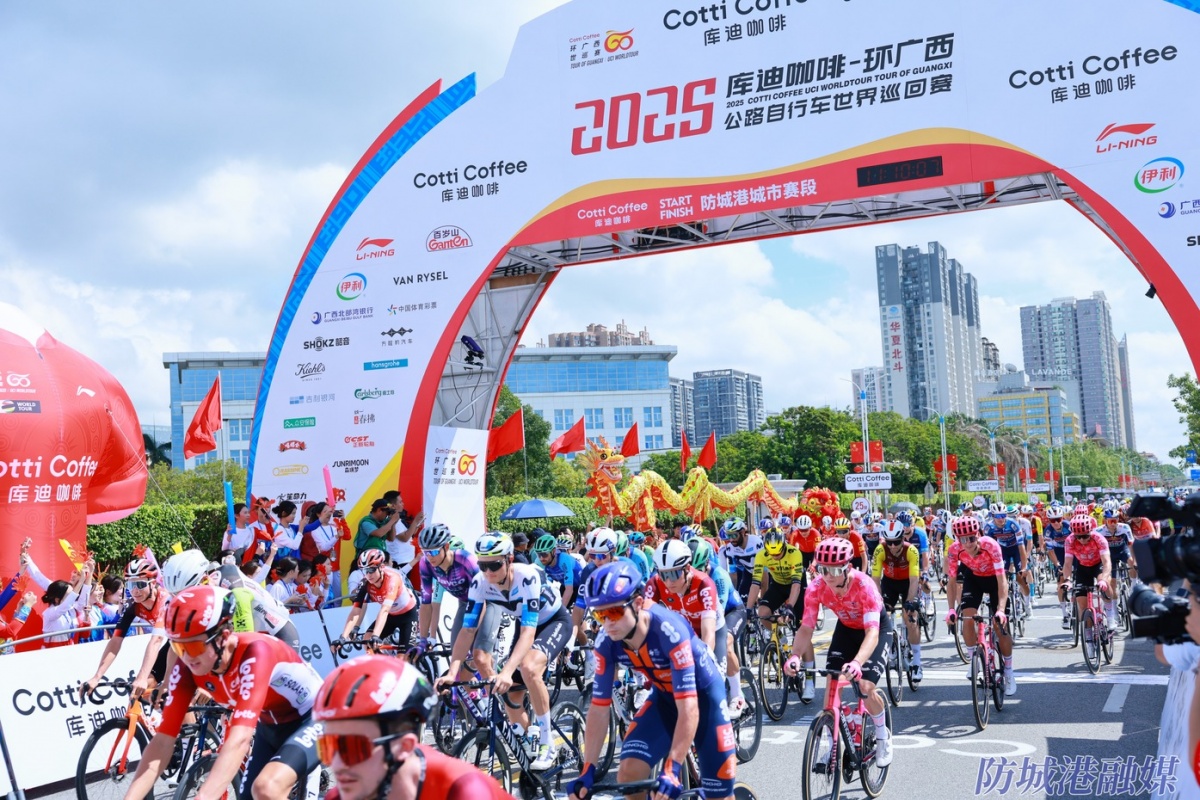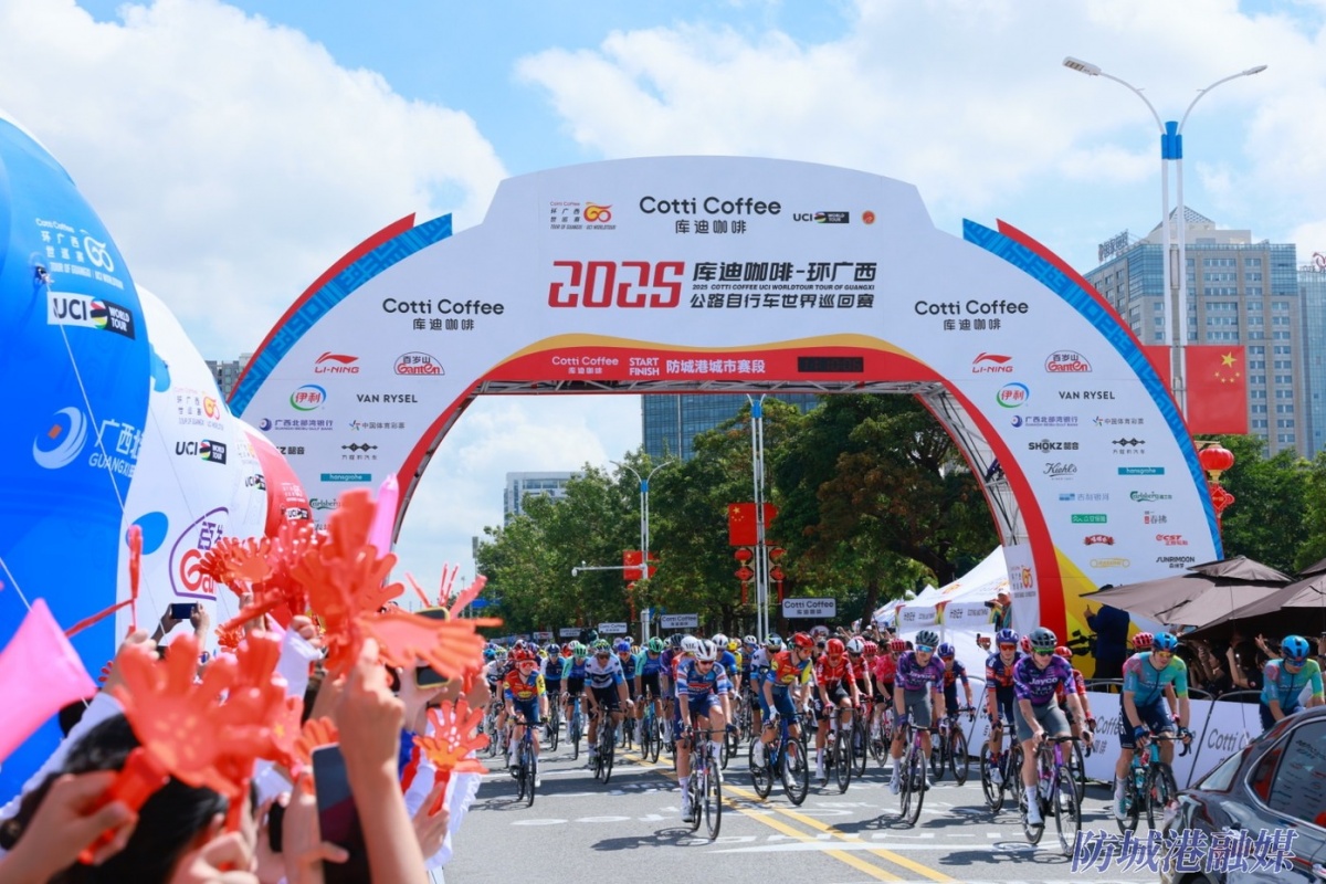10月14日 2025年環(huán)廣西公路自行車世界巡回賽 (防城港城市賽段) 發(fā)車儀式 在防城港市北部灣海洋文化公園舉行 上午11時10分 在現(xiàn)場觀眾的歡呼聲中 來自中國國家隊(duì)在內(nèi)的全球各地20支頂級車隊(duì) 共140名參賽車手 從北部灣海洋文化公園出發(fā) 向第一賽段——防城港城市賽段 的冠軍發(fā)起沖擊! 賽段競賽距離為148.8公里 以北部灣海洋文化公園為起終點(diǎn) 途經(jīng)西岸公園、國門大道、 龍馬明珠廣場、伏波文化園 等多個地標(biāo)景點(diǎn) 讓參賽車手在美麗的海景賽道上騎行的同時 盡享防城港市的濱海風(fēng)情和獨(dú)特魅力 下面就一起看看比賽現(xiàn)場吧