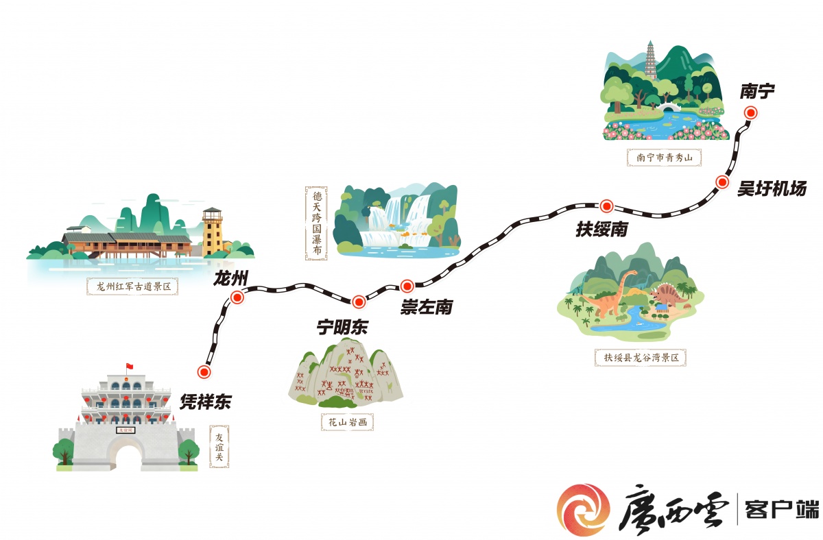 建于19世紀(jì)末的龍州火車站,后改為法國(guó)駐龍州領(lǐng)事館。 百年滄桑巨變,鐵路夢(mèng)想終于照進(jìn)現(xiàn)實(shí)。 此刻,D9668次首發(fā)列車上,熱鬧非凡。旅客周安吉身著民族服飾,一邊撥動(dòng)天琴琴弦,一邊引吭高歌,表達(dá)對(duì)家鄉(xiāng)開(kāi)通高鐵的激動(dòng)心情,引來(lái)陣陣喝彩。 龍州是一片紅色熱土。95年前,鄧小平等老一輩無(wú)產(chǎn)階級(jí)革命家在這里領(lǐng)導(dǎo)發(fā)動(dòng)了震驚中外的龍州起義,建立了左江革命根據(jù)地。 2022年7月,南憑高鐵崇憑段開(kāi)工建設(shè),設(shè)計(jì)時(shí)速250公里。這條全長(zhǎng)約81公里的鐵路,宛如一張拉滿的弓,自崇左南站引出后,經(jīng)寧明往西北拐一個(gè)彎到龍州,再南下延伸至終點(diǎn)站憑祥東站。