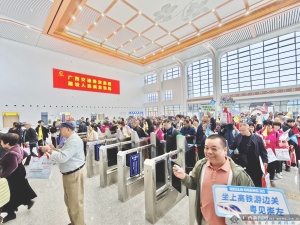 12月5日,隨著D9668次列車駛出憑祥東站,標志著南寧至憑祥高鐵全線貫通運營。本次開通運營的南憑高鐵崇憑段起自崇左南站,經崇左市,終至憑祥市憑祥東站,線路全長81公里,設計時速250公里。全線共設崇左南、寧明東、龍州、憑祥東站。圖為南寧至憑祥高鐵開通首日,旅客紛紛涌入車站,見證這一歷史時刻。記者 李家州 攝(廣西云-廣西日報)