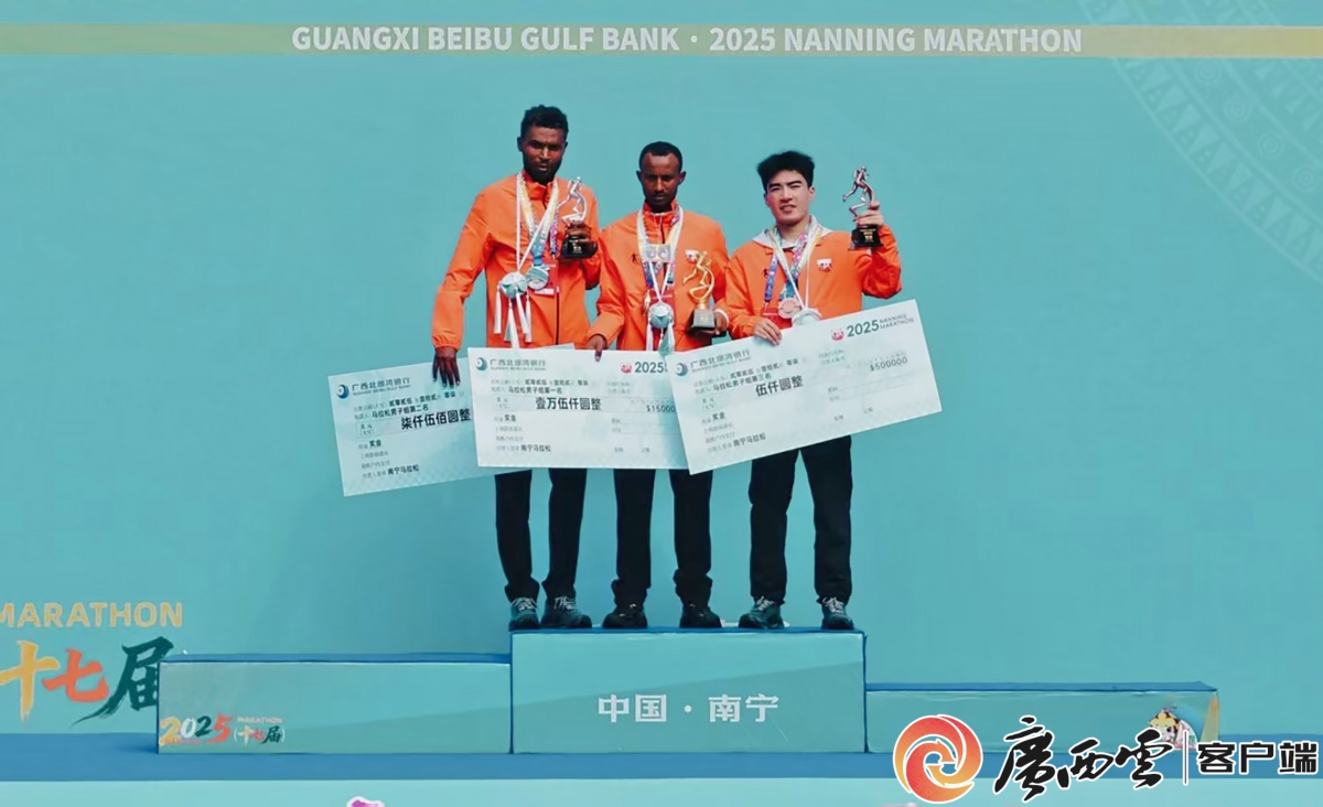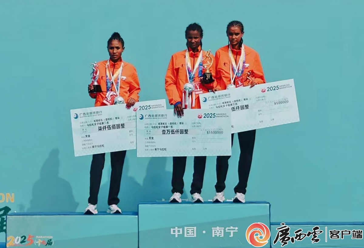 全馬女子組前三名選手合影,三人均來(lái)自埃塞俄比亞。記者 周軍 攝 這是一場(chǎng)展示南寧城市景觀的跑者盛會(huì)。從起點(diǎn)出發(fā),率先進(jìn)入的是6公里長(zhǎng)充滿現(xiàn)代氣息的民族大道跑道,南湖公園段湖光景色與城市天際線相映成趣,東盟商務(wù)區(qū)段南寧國(guó)際會(huì)展中心與現(xiàn)代化高樓相繼闖入眼簾。隊(duì)伍隨后轉(zhuǎn)往青秀山風(fēng)景區(qū)沿線和邕江兩岸奔跑,一路綠樹成蔭、江水蜿蜒,遠(yuǎn)處山巒疊翠、邕江碧波蕩漾,近處滿眼青綠、清風(fēng)絲絲拂面,充分感受到南寧“半城綠樹半城樓”的生態(tài)宜居之美。