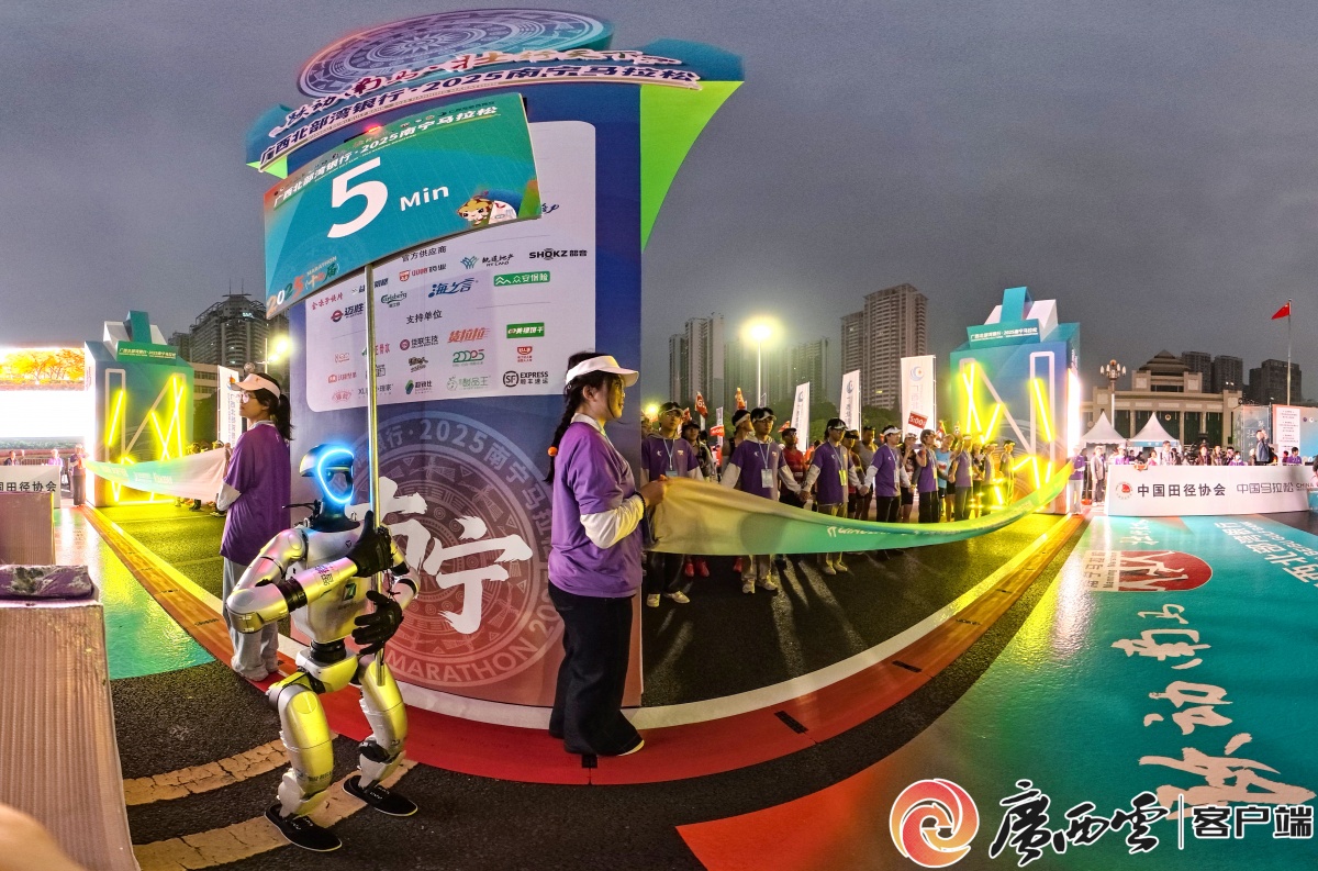 南馬比賽現(xiàn)場(chǎng),跑者們?cè)谌绠嬶L(fēng)光賽道中跑步行進(jìn)。記者 周軍 攝 今年的南寧馬拉松是中國(guó)田徑協(xié)會(huì)最高級(jí)別認(rèn)證的A1類賽事,設(shè)有馬拉松、半程馬拉松兩個(gè)項(xiàng)目,共有36000人參賽,創(chuàng)下規(guī)模新高。其中,全馬人數(shù)12000人,半馬人數(shù)24000人。比賽于7時(shí)30分在民族廣場(chǎng)發(fā)槍,全馬選手率先出發(fā),隨后半馬分兩次發(fā)槍。起跑儀式上,AI機(jī)器人手持倒計(jì)時(shí)牌提醒出發(fā),使得賽事科技感十足?茖W(xué)規(guī)劃的分槍、分區(qū)起跑,有效避免擁擠,提升了參賽體驗(yàn)。