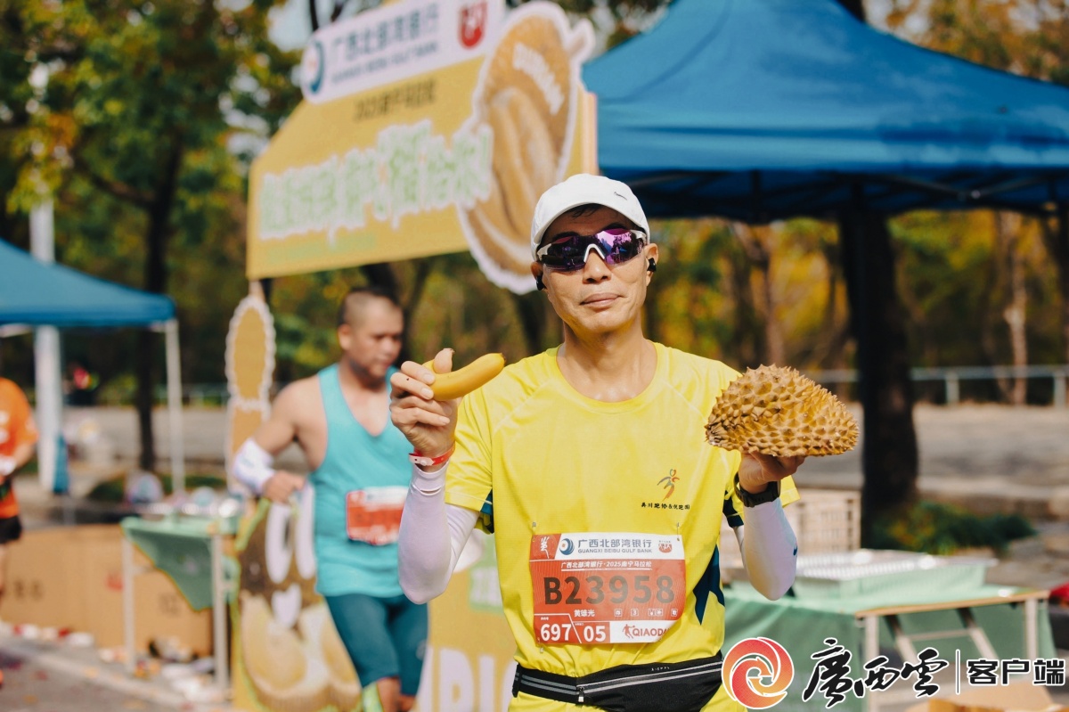 實(shí)現(xiàn)榴蓮自由的跑者。組委會(huì)供圖 “老友文化”作為南寧的文化標(biāo)簽也在賽道內(nèi)流淌。組委會(huì)組織本地市民組成“老友領(lǐng)航團(tuán)”“老友能量站”穿梭于起終點(diǎn)與賽道,提供入場(chǎng)參賽和完賽退場(chǎng)指引,沿途以地道的南寧話為跑者加油。一位來(lái)自北京的女性跑者贊道:“兩廣尤其廣西的比賽非常有特色,志愿者們加油聲后面的‘喔~’的尾音讓人溫暖,記憶深刻!币曊吓苷咧炜∥辉谂闩軉T輔助下完賽后表示,南馬非常有人文溫度。